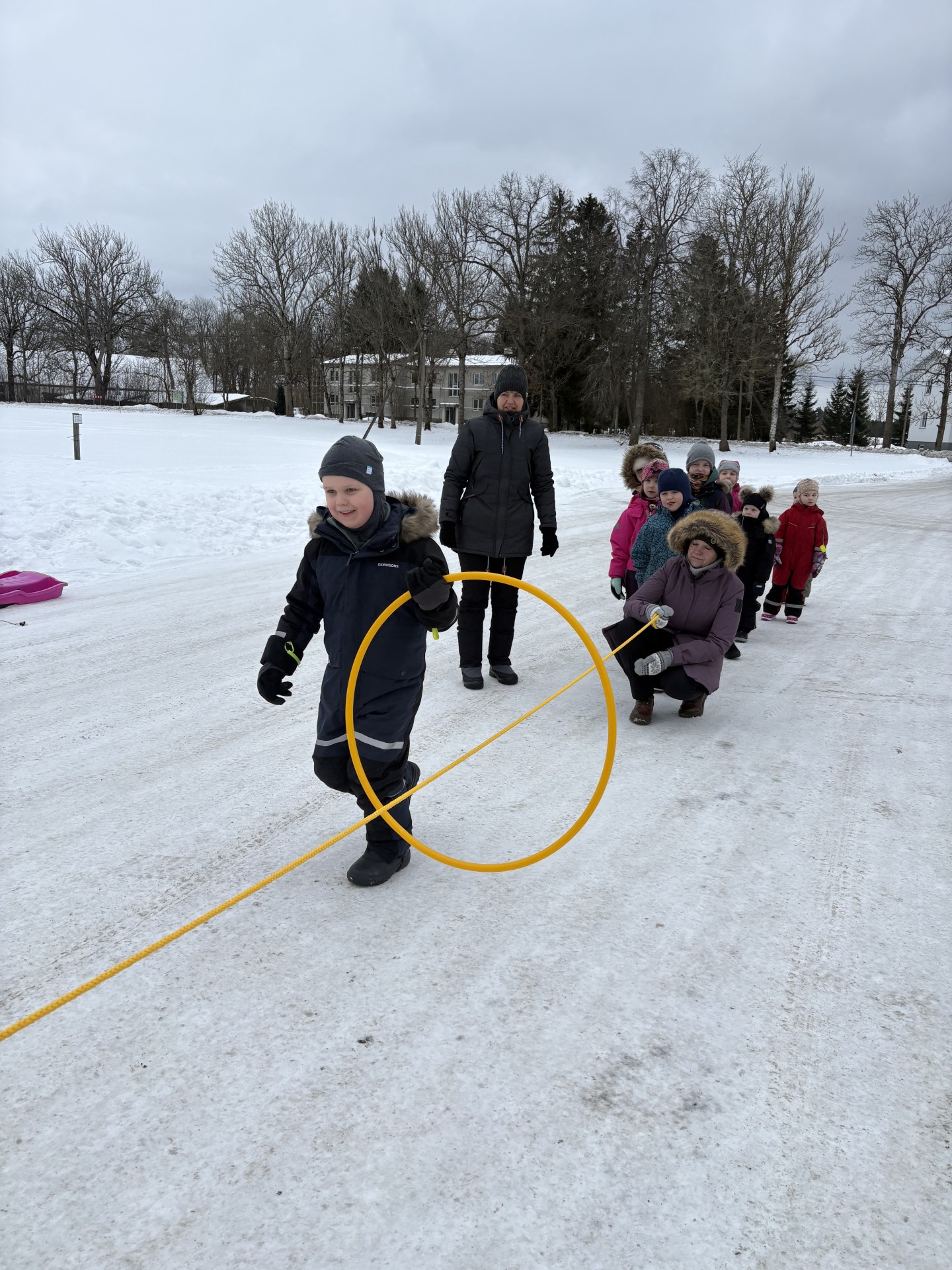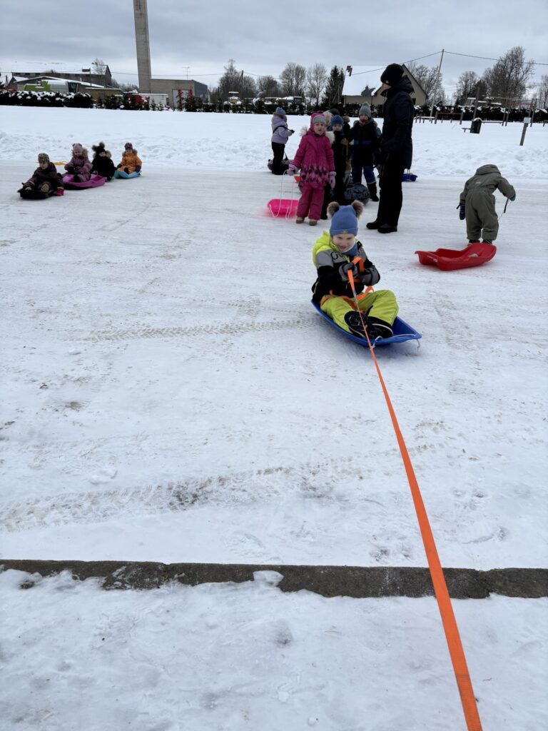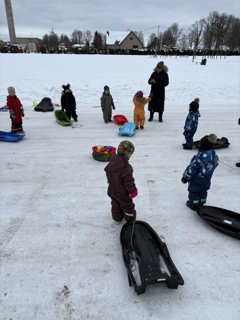Jõud ja osavus: Kelkudel käis vilgas tegevus – lapsed tõmbasid end köie abil edasi ning harjutasid pallivedu ja täpsust pallide kelgule paigutamisel.