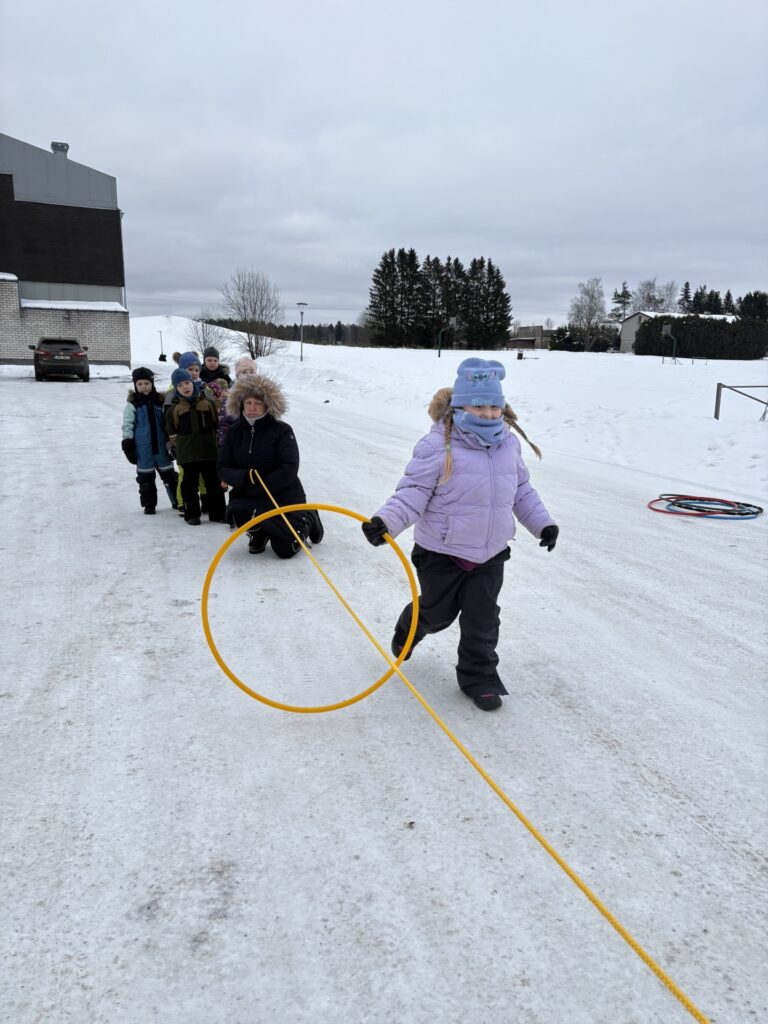 Rõngaste ralli: Harjutasime täpsust olümpiarõngaste vedamisel ja nendest läbi pugemisel.