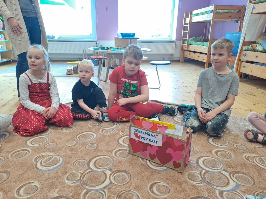 Täna, 13.veebruaril, tähistasid Naerulinnud ja Õnneseened lasteaiapäeva koos. Käisid üksteisel rühmades külas, mängisid lõbusaid ringmänge, õppisid tähti, kleepisid paberile südamepuud. Ühised sportlikud mängud võimlas nagu palli hüpitamine, segi läinud käpikute ja mütside otsimine andsid päevale lusti juurde ning üks lõbus disco käib ikka ka sõbrapäeva juurde. Nädala jooksul oli võimalus meisterdada sõbrakaart ja panna postkasti, mis siis täna avati. Üllatus oli suur kui väike sõber sai endale toreda sõnumiga kaardi.